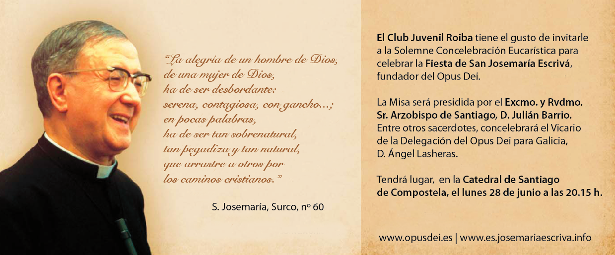 Solemne Concelebración Eucarística para celebrar la Fiesta de S. Josemaría. Lunes 28, a las 20.15h. Catedral de Santiago.