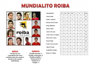 Desde hace dos semanas celebramos los viernes -en vez de actividades ordinarias- nuestro Mundialito ROIBA 2010. Es una competición individual donde los dos equipos se eligen entre los socios que aparecen cada jornada en el Isaac Peral. Cada viernes se juegan una serie de partidos de 10 minutos donde se dan puntos por distintos conceptos. Llevamos dos jornadas -4 y 11 de junio- y Pepe Pantín comanda la clasificación.